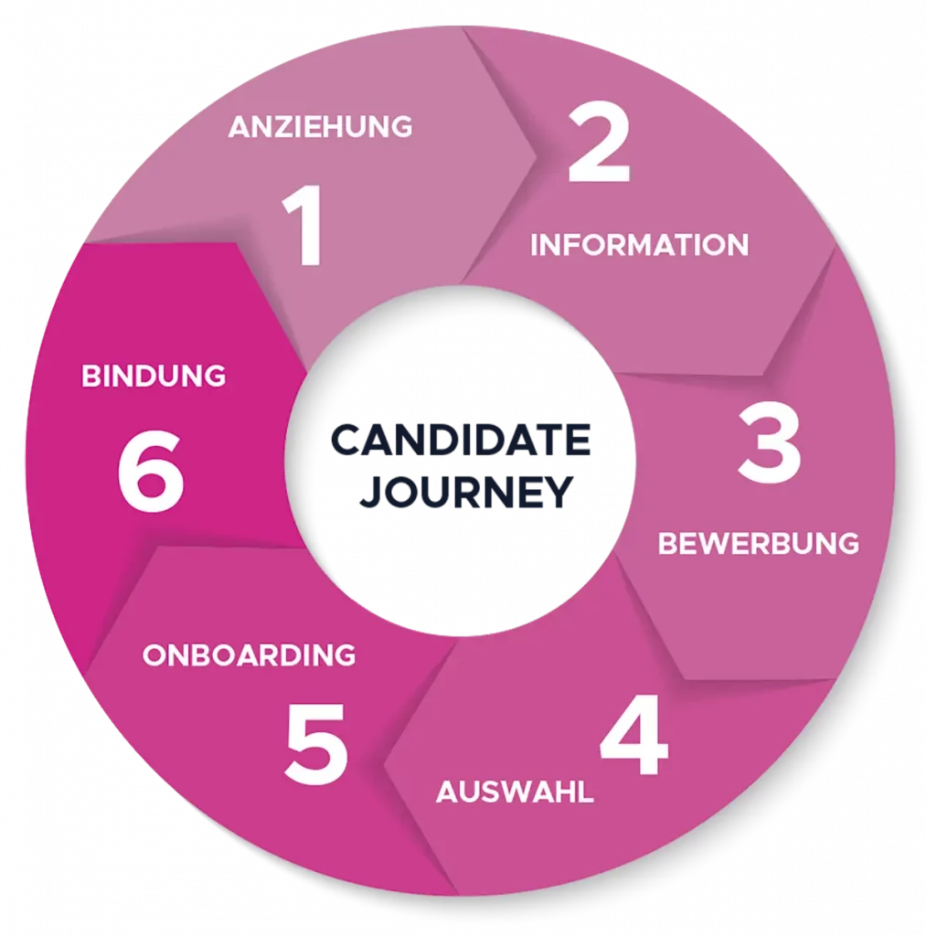 Zum Employer Branding gehört der EVP (Employer Value Proposition), die EVP Umsetzung auf der Karrierewebseite, das Formulieren passender Bewerberenden Profile sowie die Candidate Journey (Reise des Bewerbenden beim Bewerbungsprozess) sowie das Onboarding.